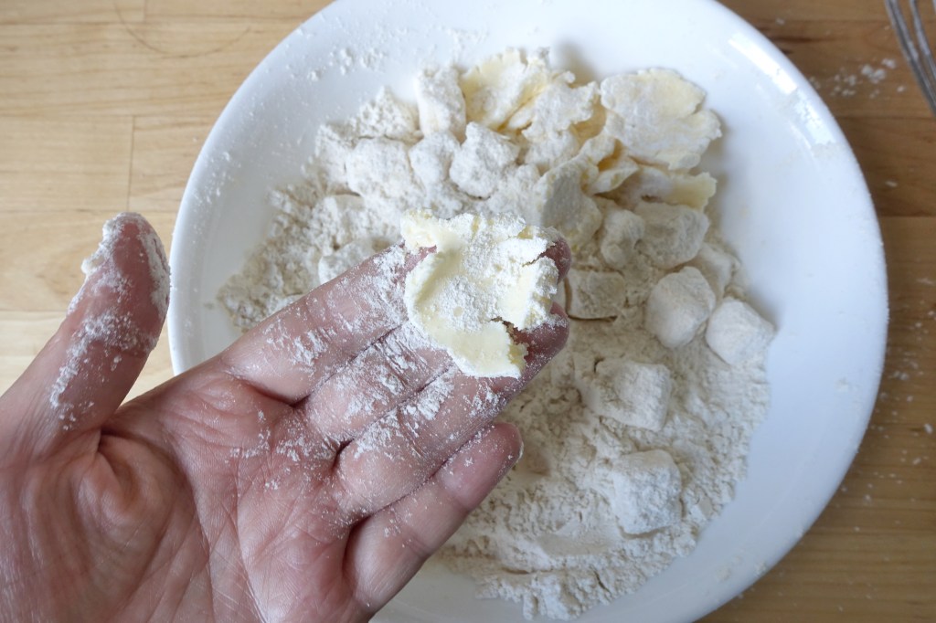 One at a time (or one in each hand), grab a butter cube and smash it flat with your thumb against your index and middle fingers. Drop it back in the bowl and repeat with the rest of the cubes, tossing to coat in flour and distribute them evenly.