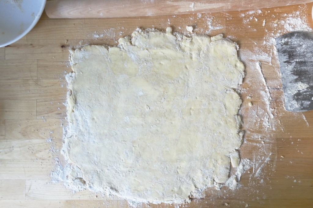 This galette is built on an American-style flaky pie crust. Right now, I’ve been using Stella Parks’ recipe from her book BraveTart: Iconic American Desserts (highly recommend the book, though the recipe is also available on Serious Eats). It includes a folding step to get extra flaky layers– she has a great video and photos on the Serious Eats website, and I’ve included photos below. She calls for low-protein all-purpose flour in this recipe, but I have a hard time finding that so I tend to use a blend of flours.