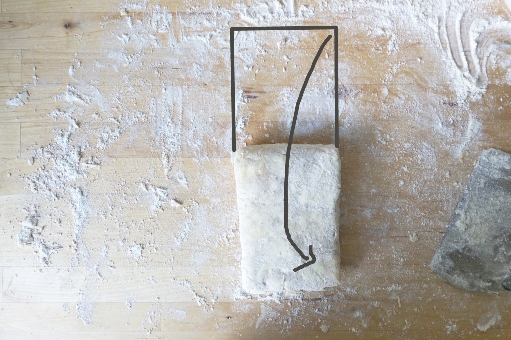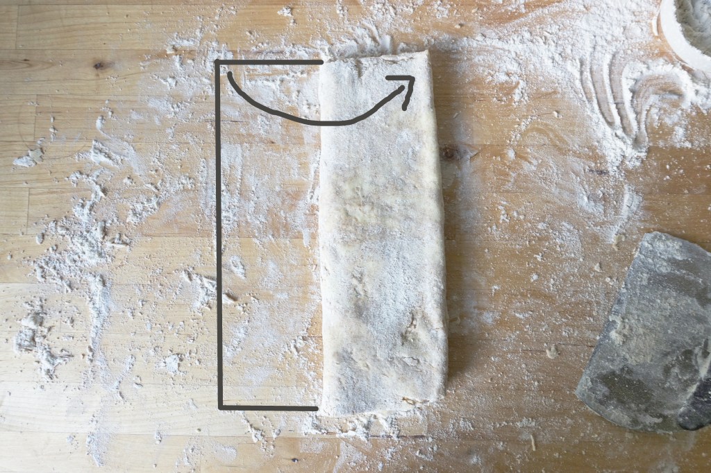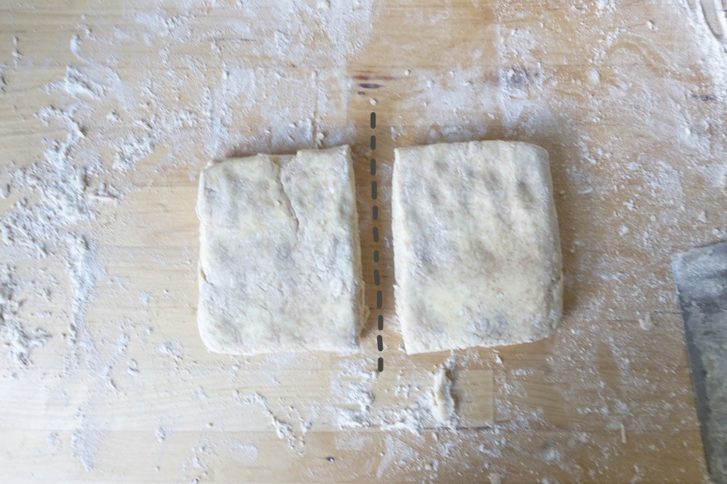 Brush the excess flour off the top surface of the dough. Take the short ends and fold them to meet in the centre (photos at end). If you don’t have a perfect rectangle, you can cut the bits that hang off and use them to patch up spots where the dough doesn’t meet. Fold that across the midline like a book to get a long rectangle. Fold the short sides towards each other, and cut that in half to get two equal square pieces.
