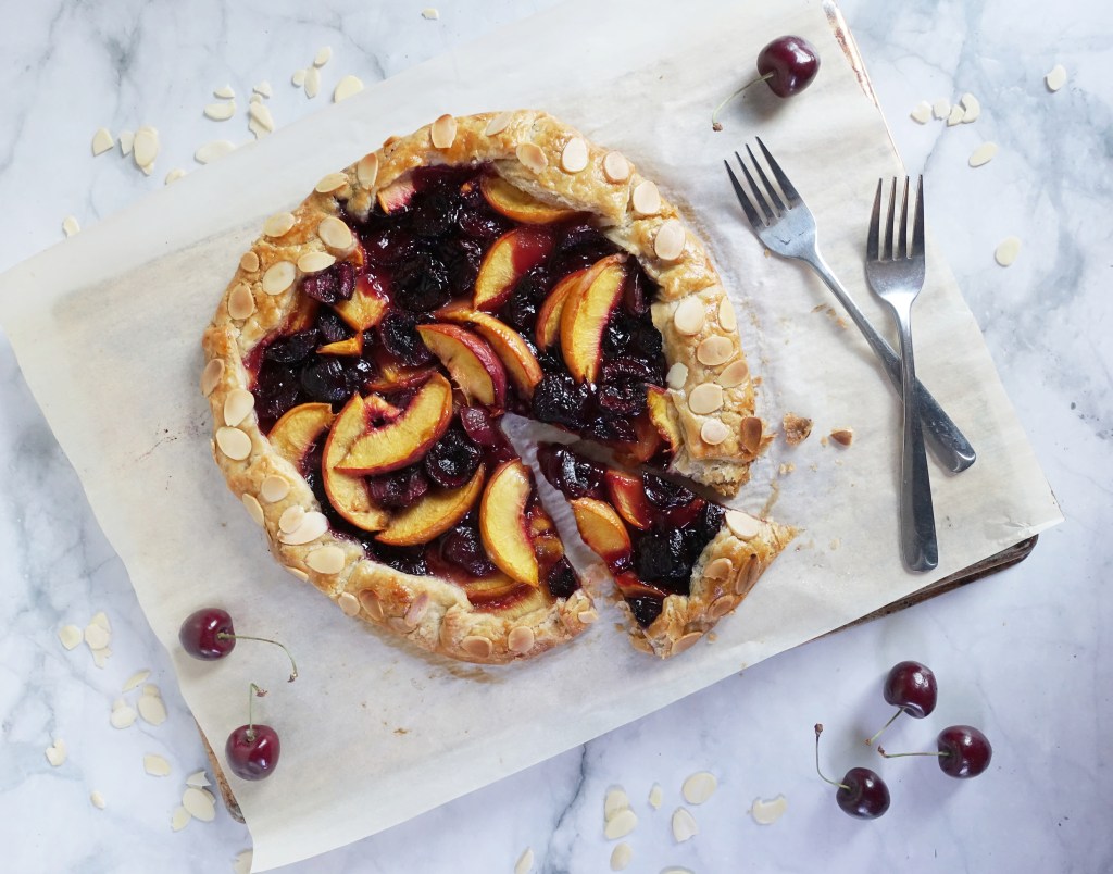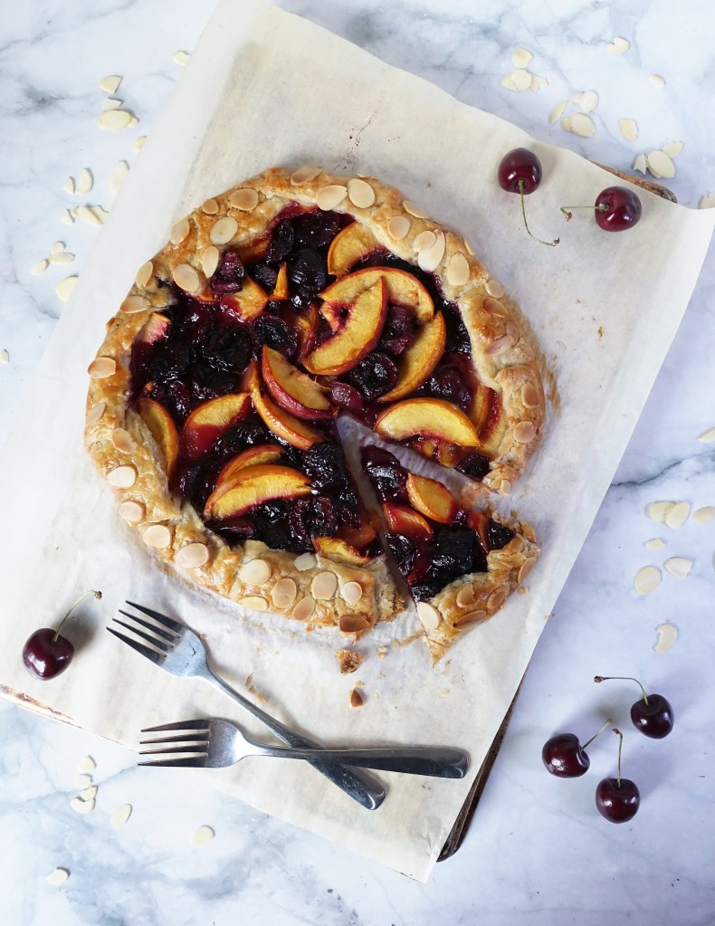 Prepare right before using. Slice the peaches into pieces slightly larger than you want (they’ll shrink once they’re baked). You could do 2cm-thick slices, cubes, etc. Pit and halve the cherries. Whisk the sugar, cornstarch, and salt together in a small bowl and then sprinkle over the fruit, tossing just until everything is evenly distributed. Fill the crust and bake immmediately.