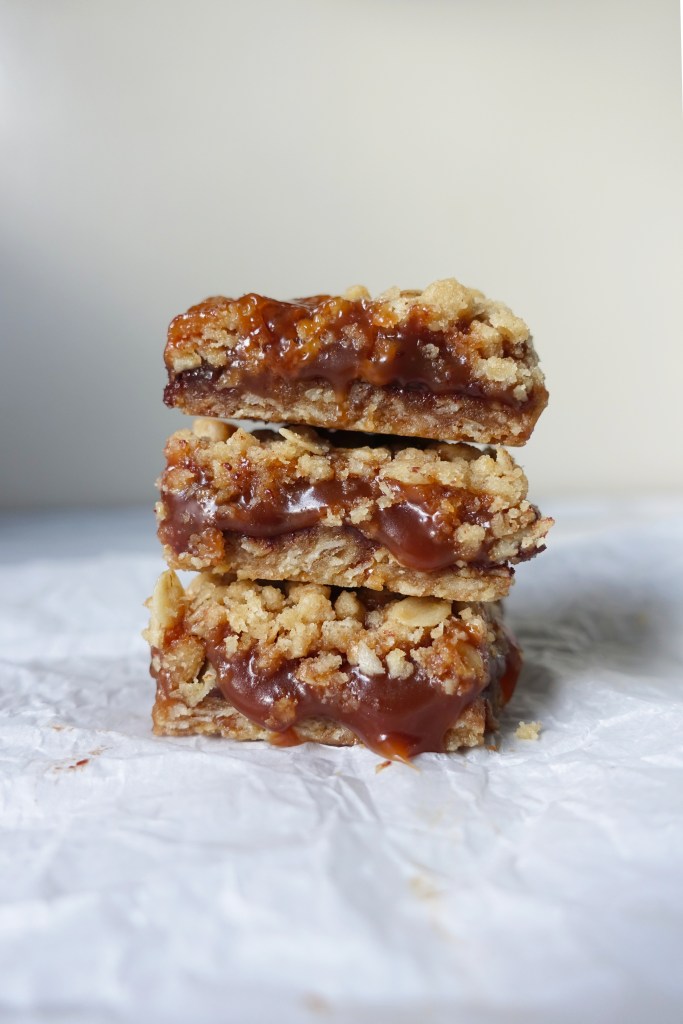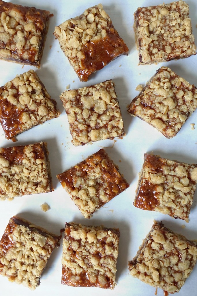 Sprinkle evenly with the remaining oat mixture and return to the oven for 15-20 minutes until the top is lightly browned and the caramel is bubbling at the edges.
