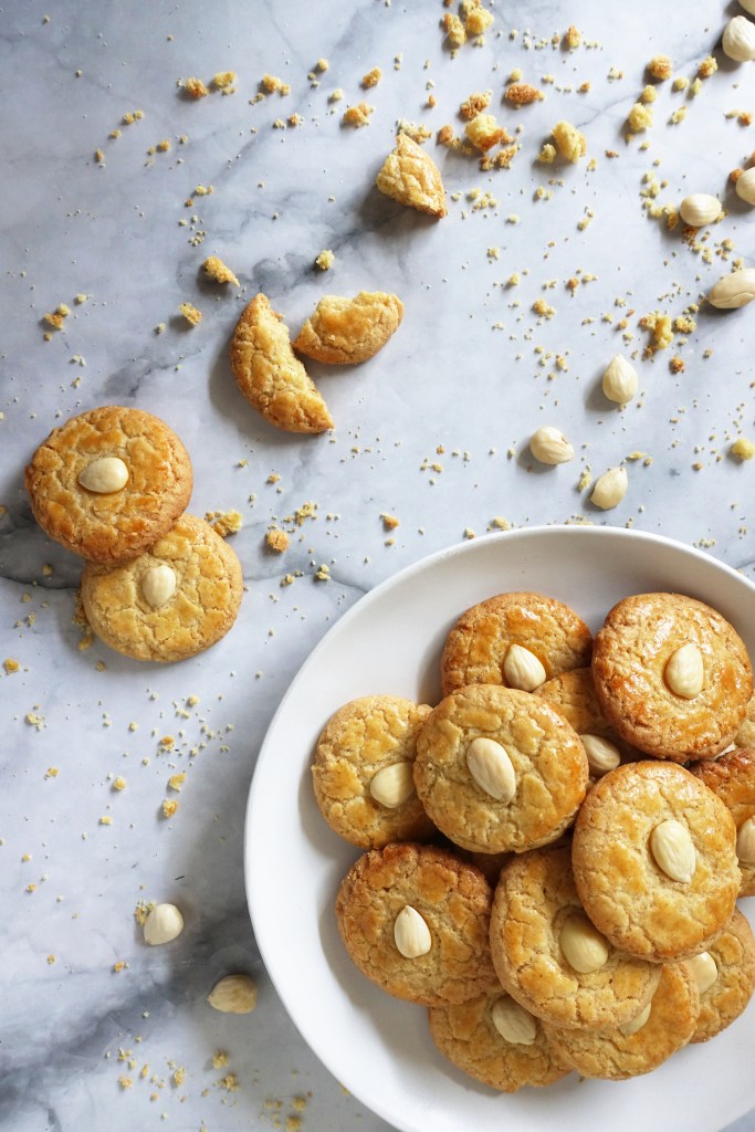 When you get almond cookies in stores or at restaurants, they can sometimes be almost neon yellow. My version doesn’t involve food colouring so they’re a little less neon and a little more golden. You can add food colouring if you’d like, but to naturally boost the colour you can opt for organic, free-range, or free-run eggs: those tend to have the most vibrant yolks because of what the hens eat.
